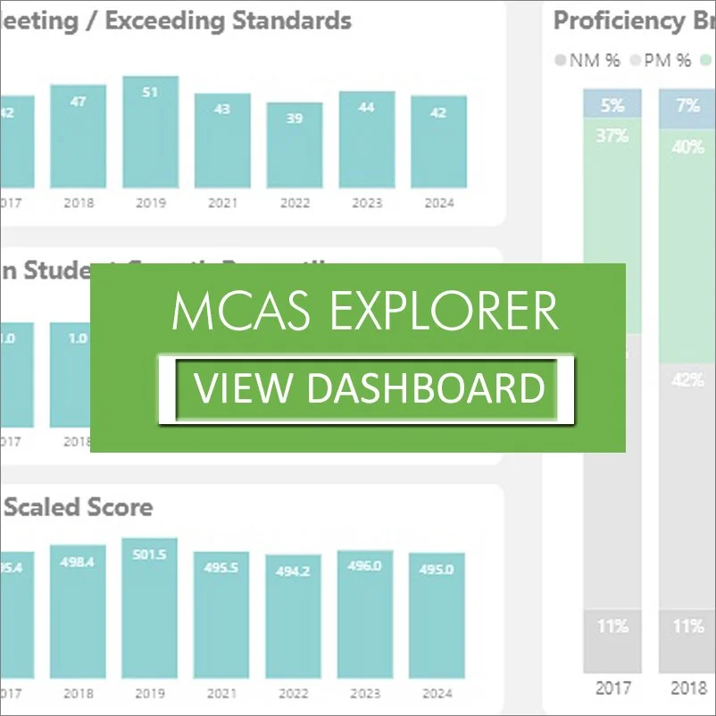 The MCAS Explorer Dashboard provides breakdowns of MCAS scores and proficiency rates for English Language Arts, Mathematics, and Science. The data is useful for examining MCAS scores over time and comparing results among districts.