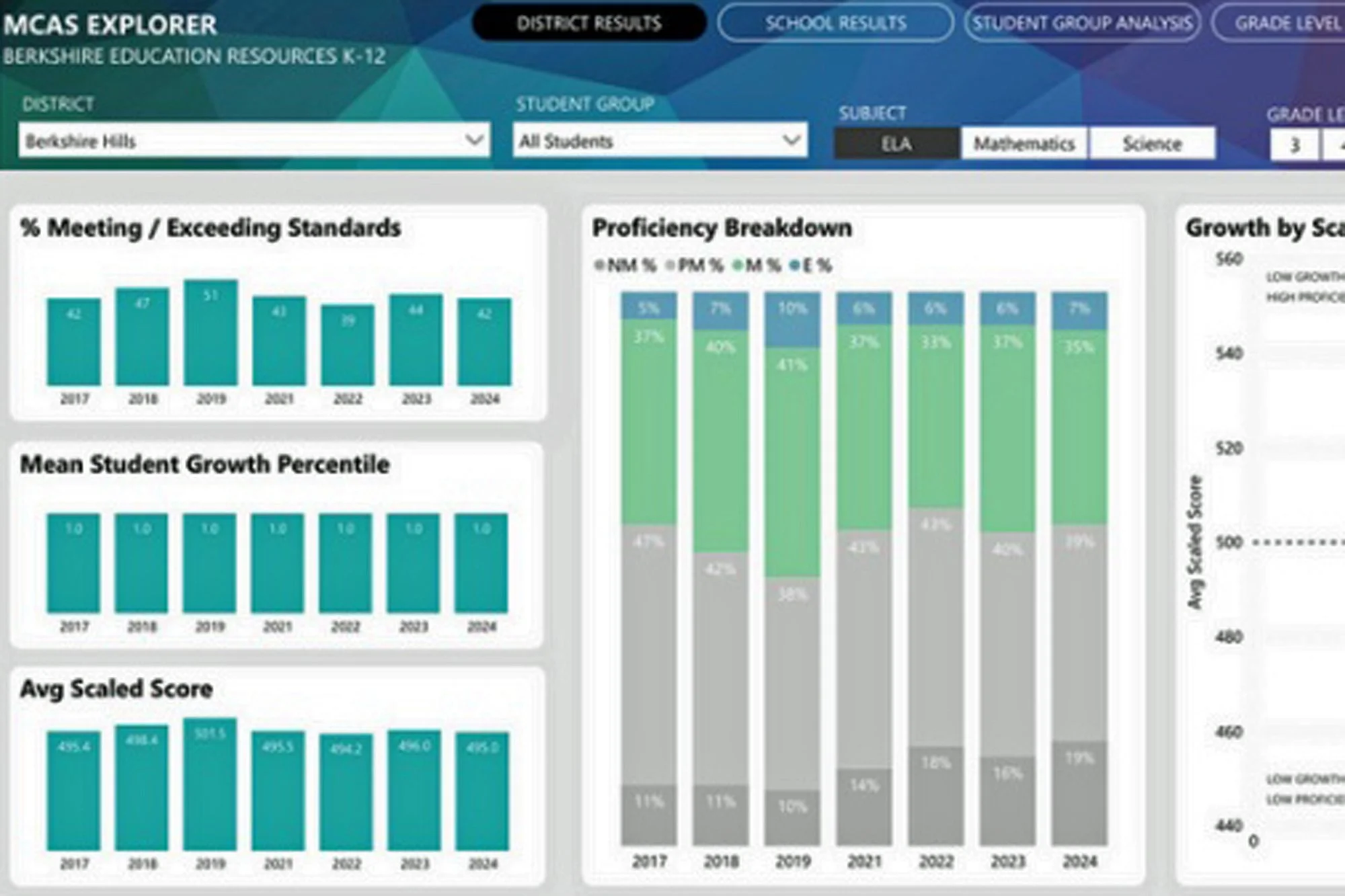 Overview. The BERK12.org website features four interactive dashboards, designed in partnership with Open Architects. The dashboards provide accurate, timely data about educational trends and outcomes in Berkshire County in the areas of academics, enrollment, finance, and MCAS. The data can be broken down by school, district, and other subcategories, providing a resource for districts and community partners to retrieve data needed for reporting, grant applications, and analysis. The dashboards are also useful for community members who want to know more about the schools in the region. As shown below, the MCAS dashboard provides information such as growth percentile, scores, and proficiency levels.